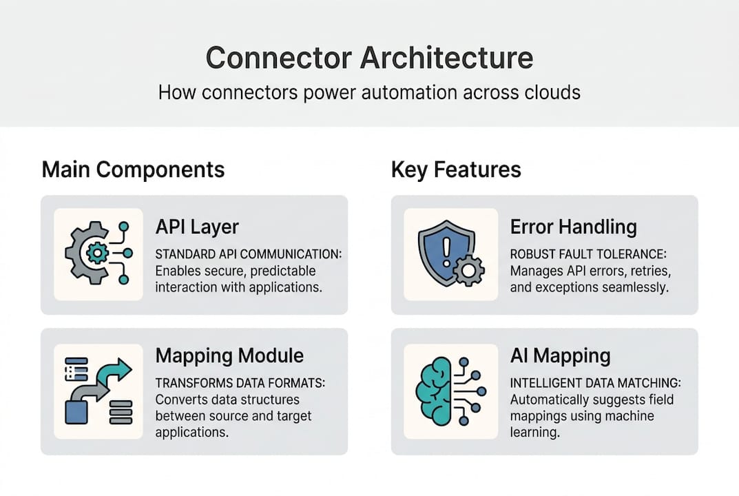 Modern platforms offer libraries of over 1,000 connectors. That's 1,000 integrations your team doesn't have to build from scratch. The real magic is in what connectors handle automatically: